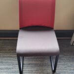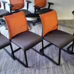Demander un devisChaise visiteur STEELCASE ‘Reply Air’ dossier résille de couleur (11 orange, 10 vert et 8 rouge) – assise tissu taupe – piétement luge époxy noir – très confortable – produit très propre – occasion